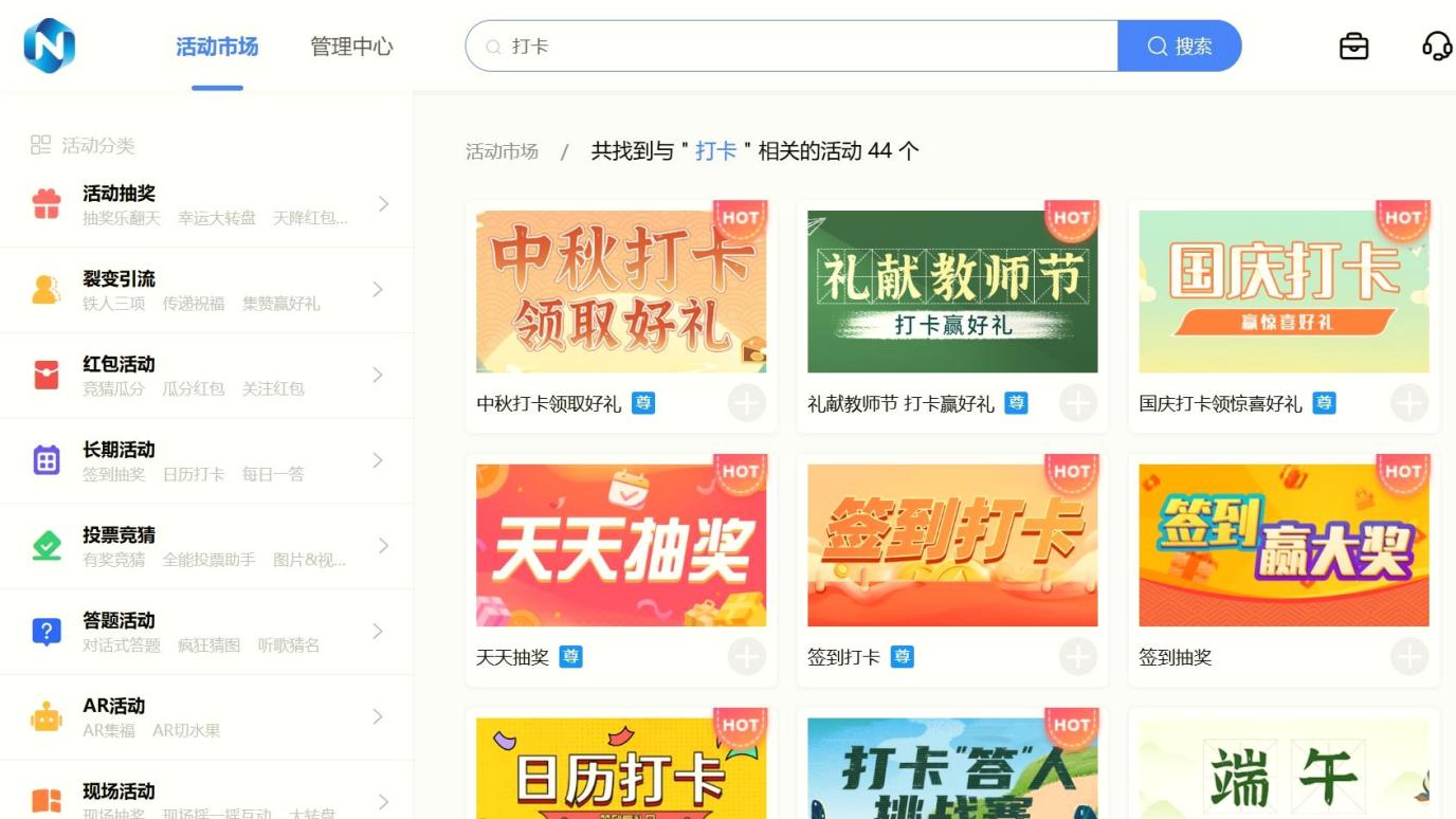 点击左侧【活动模板库】,提前浏览适合自己行业的模板(比如餐饮选 “满减核销”,零售选 “抽奖拉新”),把常用模板加入【我的收藏】,后续做活动时直接调用,不用每次都重新找模板,进一步简化流程。 二、Step1:用工具简化活动搭建,10 分钟出方案,拒绝 “无效加班”对中小企业来说,时间就是成本!乔拓云工具的快速搭建能力,能让你把更多精力放在活动创意上,而非技术操作,10 分钟就能拿出可落地的活动方案。 点击【活动中心】-【创建活动】,从【我的收藏】里选择对应模板(或直接搜索活动类型,比如 “中秋促销”),点击【立即使用】。乔拓云模板搭建速度快,10 分钟就能搞定,模板里的文案、图片、按钮位置都已按行业最佳实践设计好,比如餐饮模板会自带 “扫码核销”“满减规则”,不用自己从零构思。