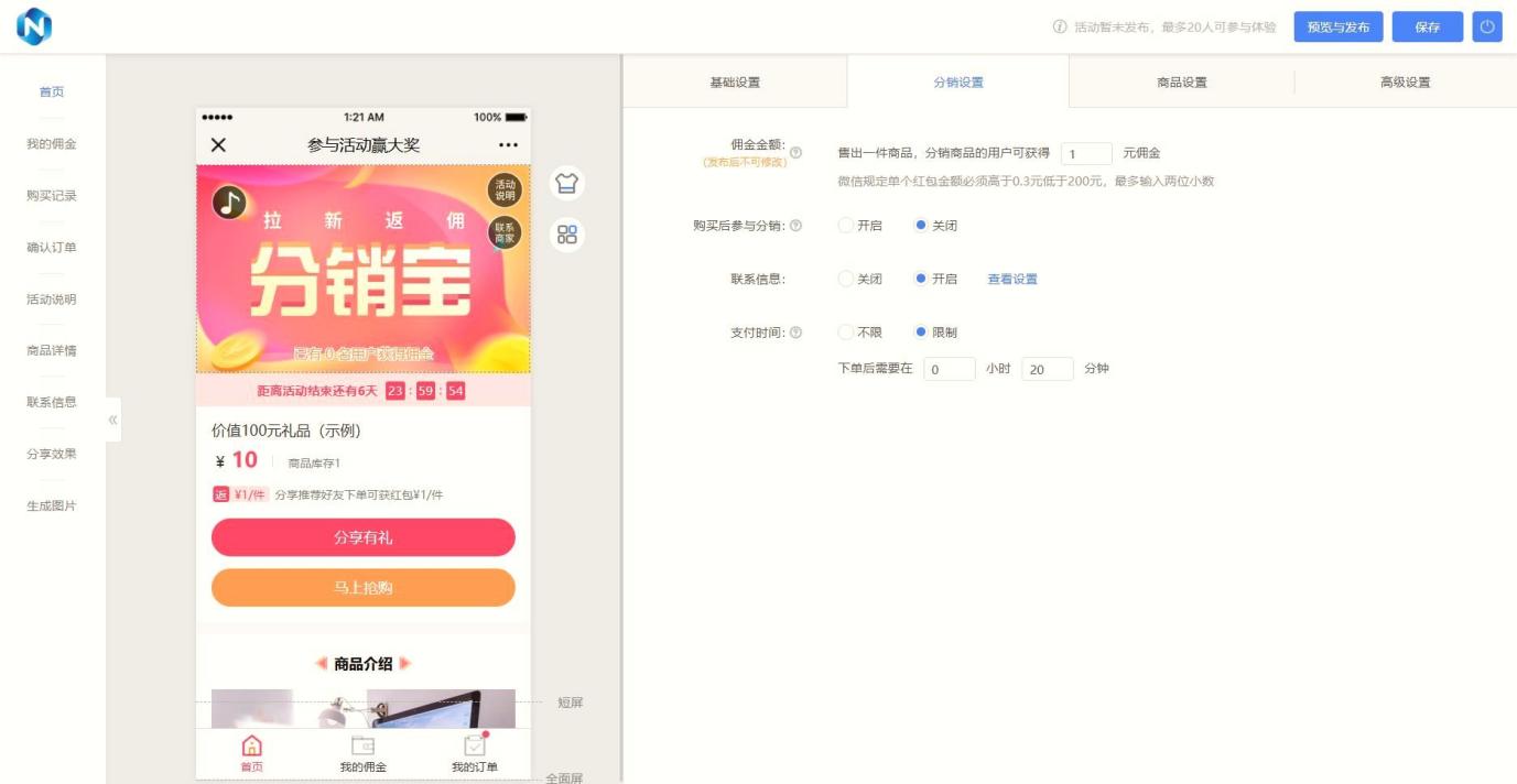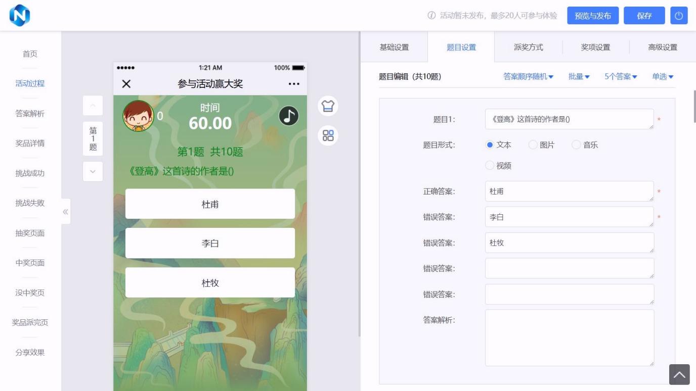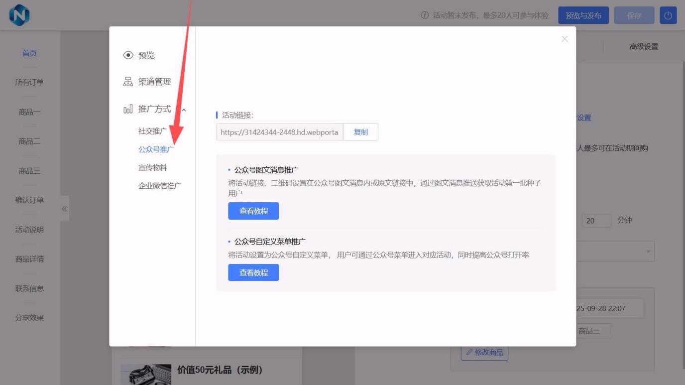 进入全栈可视化编辑界面,用拖拉拽功能调整活动细节,全程不用写代码: 改活动信息:双击文字就能修改活动时间、优惠力度(比如把 “满 100 减 20” 改成 “满 80 减 20”);点击图片直接上传自己的产品图、门店图,系统会自动优化图片尺寸,不用手动调整。 加核心功能:想加抽奖?从左侧组件栏拖入 “抽奖模块”,选择奖品类型(优惠券、小礼品)、设置中奖率;想加核销?拖入 “核销按钮”,关联门店信息,客户到店扫码就能核销,操作超简单。 搭建完点击【预览】,用手机扫码查看实际效果,不满意随时调整。还支持免费试用,先让团队内部测试活动流程,确认没问题再正式发布,完全不用担心发布后出问题,拒绝 “无效加班”。乔拓云操作便捷,降低技术门槛,哪怕是刚接触营销工具的新手,也能快速搭建出专业活动方案。 三、Step2:用工具简化执行流程,自动化功能减少人工成本