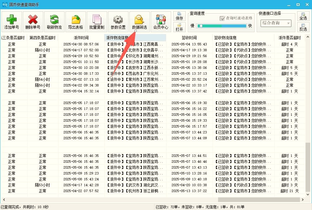 1. 5 分钟万单,同步速度业内无对手“多单号同步” 的核心痛点是慢。有的软件同步 1000 条单号要等 15 分钟,中间还频繁卡顿,大促时上万单能查到半夜。人工逐条查更离谱,100 条就得 1 小时,眼睛都盯酸了还容易错。 固乔快递查询助手的速度颠覆认知。它用分布式处理技术,把单号分配到多个节点并行查询,彻底避开接口限流问题。实测显示,1000 条单号同步仅用 38 秒,1 万单也能在 5 分钟内完成,是实打实的行业最快。对比人工优势太明显:电商卖家核查 “已揽收未发出” 订单,人工翻找 1 小时,用它筛选仅需 2 分钟,效率提升超 10 倍。